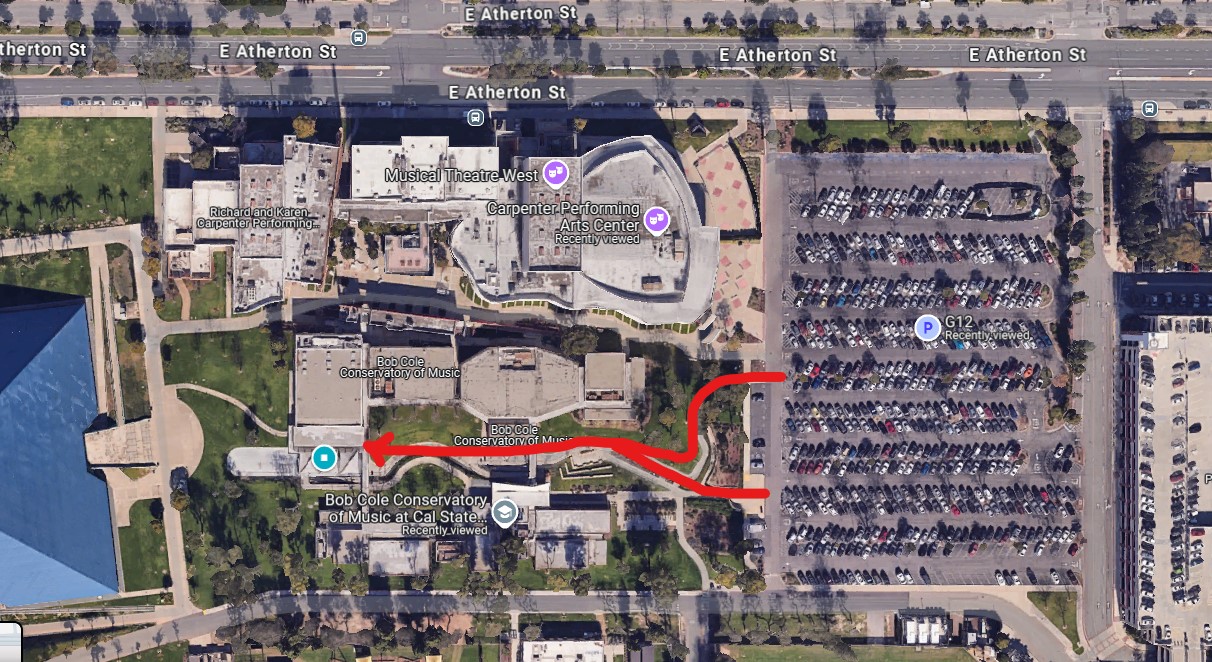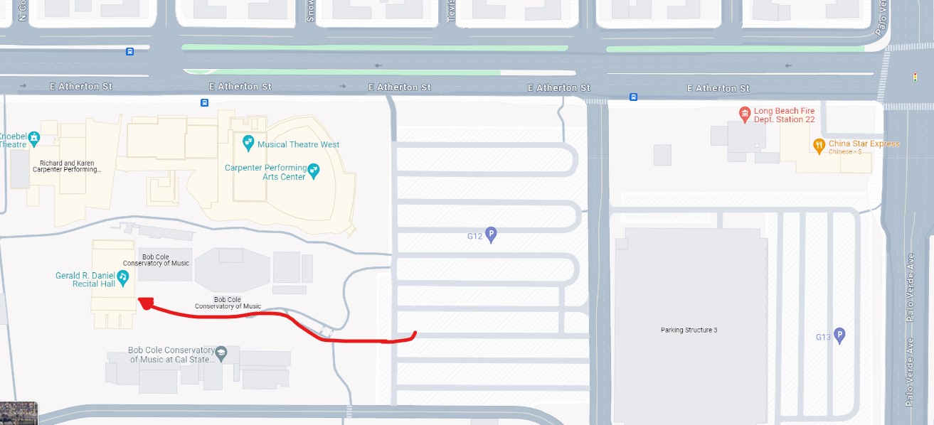This Arts center is located adjacent to parking lot G12. This is not the venue of our performance! The path to our venue lies on the left side of the Carpenter center, if facing the center from the parking lot. From parking lot G12 there will be possibly balloons or other signs to follow towards the Gerald R. Daniel Recital Hall.